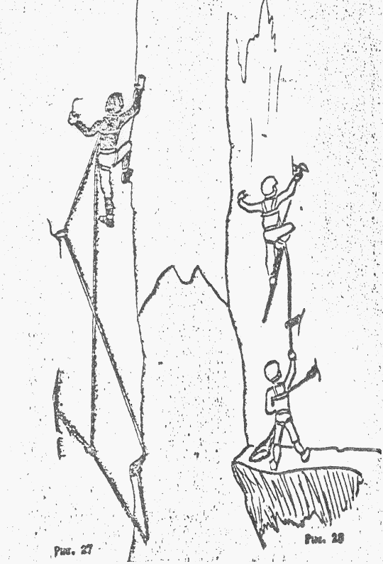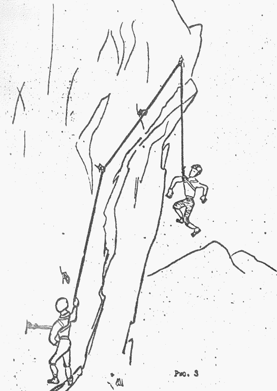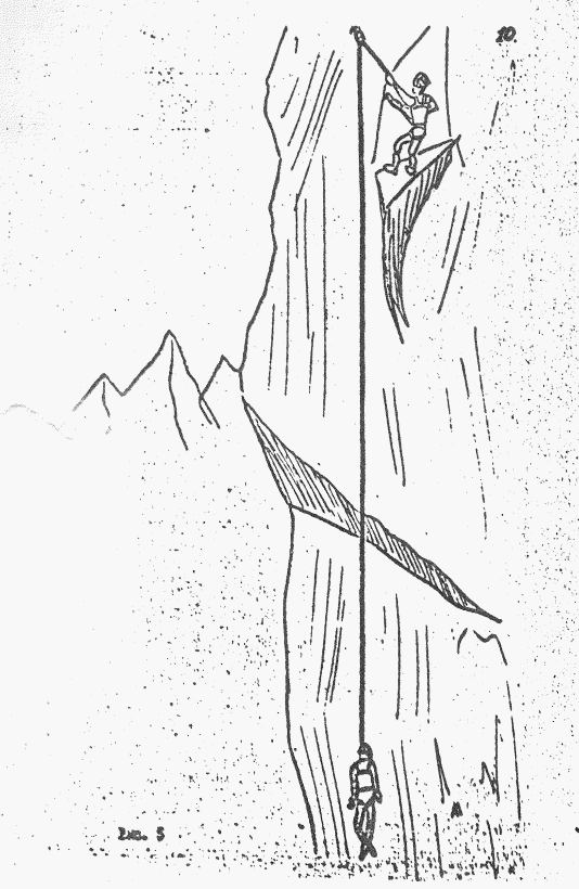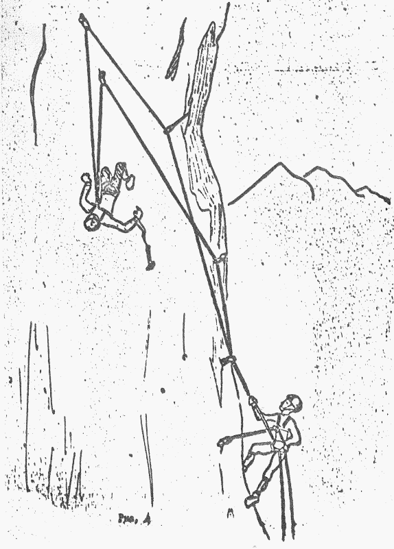 Рис 4. Поднимаясь по стенке с крючьевой страховкой на двойной веревке, первый сорвался, при срыве получил травму.