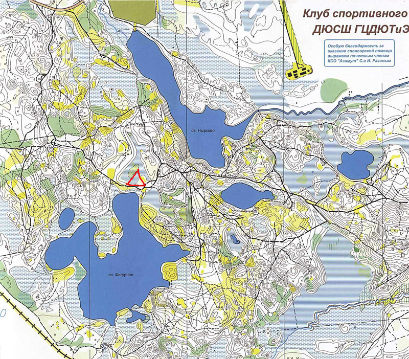 От станции Орехово (выход из последнего вагона) в сторону Петербурга перейти через дорогу (около ж/д переезда), далее по лыжне вдоль ж/д около 1 км, поворот налево по разметке лыжной стрелы. Далее около 1-1.5 км никуда не сворачивая, по лыжне подняться на горку, после спуска справа - Фигурное озеро, перед ним вытоптанная полянка со скамейкой - это место старт.